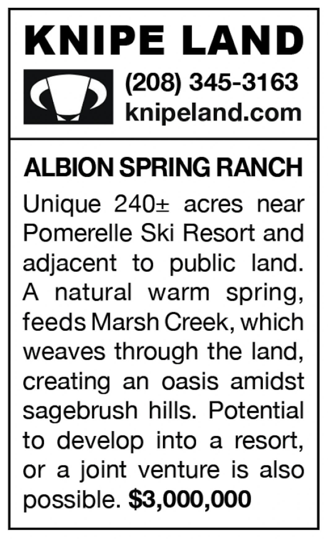 Unique 240± acres near Pomerelle Ski Resort and adjacent to public land. A natural warm spring feeds Marsh Creek, which weaves through the land creating an oasis amidst sagebrush hills. Potential to develop into a resort, or a joint venture is also possible.