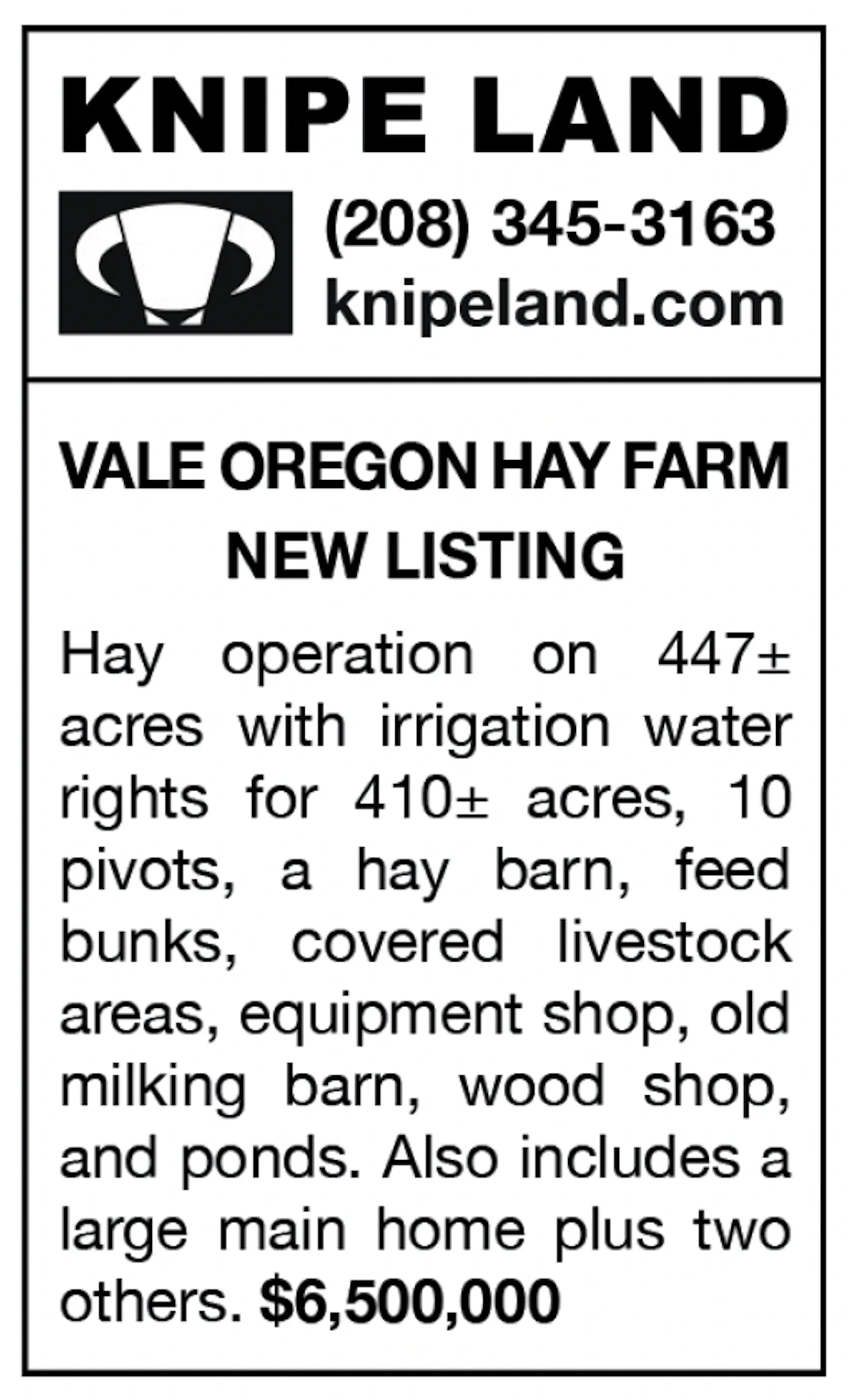 Hay operation on 447± acres with irrigation water rights for 410± acres, 10 pivots, a hay barn, feed bunks, covered livestock areas, equipment shop, old milking barn, wood shop, and ponds. Also includes a large main home plus two others.